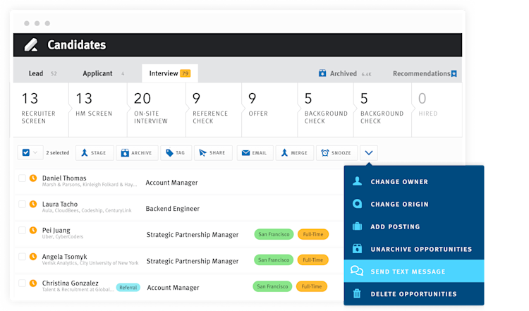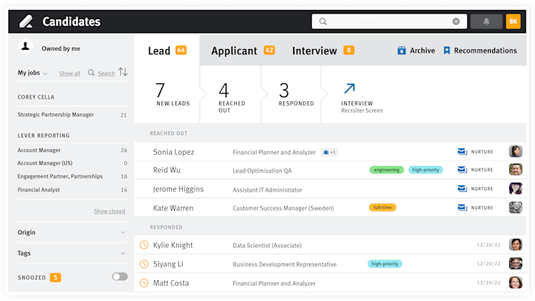 Lever recruiting software enables talent teams of all sizes to invest in a lasting talent strategy and grow their companies at scale. Unlock an authentic, efficient, people-first hiring experience designed to nurture the relationship between the best hires and your company quickly and easily.